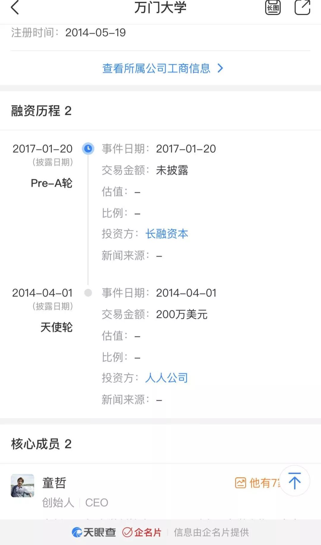 天眼查显示, 2014年4月,万门大学获得人人网天使轮投资。2017年又获得了来自长融资本的Pre-A轮融资。