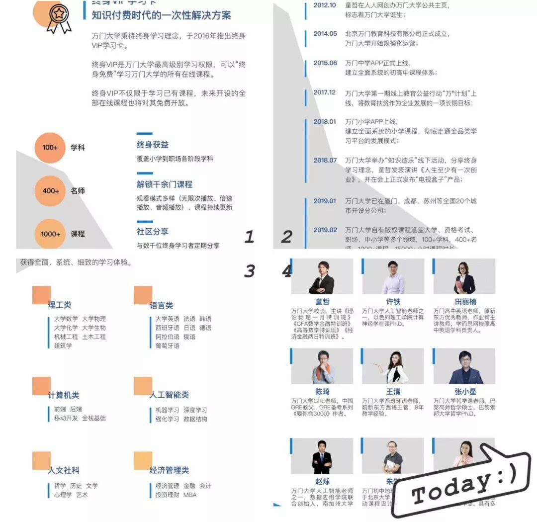 其官网介绍,万门大学提供一站式终身在线学习资源,课程内容目前涵盖职场、大学、中学、小学等1000+门课程,其中80%免费,20%收费,拥有200+位专属名师,所有课程均有行业名师大咖讲授,中学部分更是来自清华北大等名校教师,还有1000万+注册用户。