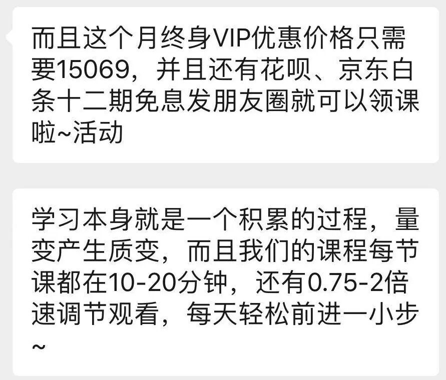 近日,号称覆盖“全品类课程”的在线教育公司万门大学对外宣称小米总裁雷军加入其终身VIP会员,并以此进行大肆营销。此前,已有网友向燃财经反映,该公司销售人员微商式刷屏卖课,且目标多针对大学生,说服他们通过花呗、京东白条组合支付购买上万元的“终身VIP”。但是,“终身VIP”能享受到的课程并不会像其宣传的那样持续更新,更像是在“收智商税”。