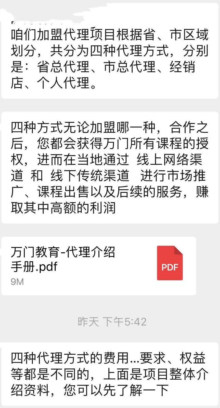 随后对方发来了一份代理介绍手册,里面包括万门简介、代理项目介绍、代理支持与申请等。