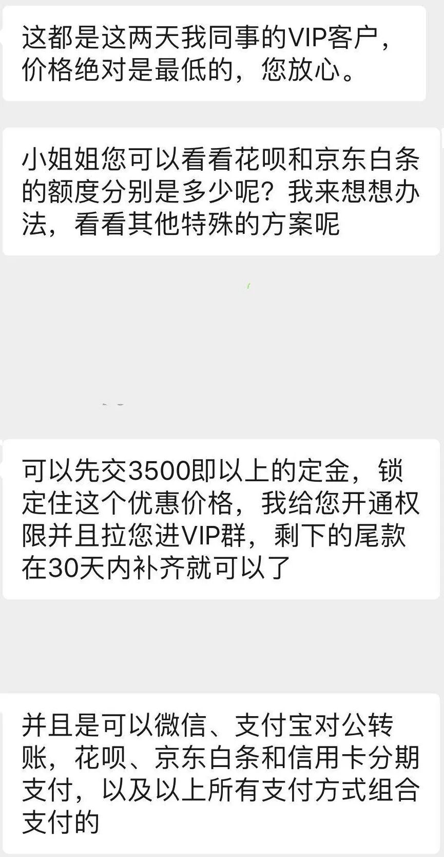 当燃财经一再表示没有这么多钱的时候,对方称可以看一下花呗和京东白条的额度是多少,她来想想办法,并提出可以先交3500元以上定金,锁定住这个优惠价格,开通权限并拉进VIP群,尾款在30天内补齐就可以,“微信、支付宝、花呗、京东白条和信用卡分期等所有支付方式都可以组合支付”,也可以先报一年VIP,价格是6498元。