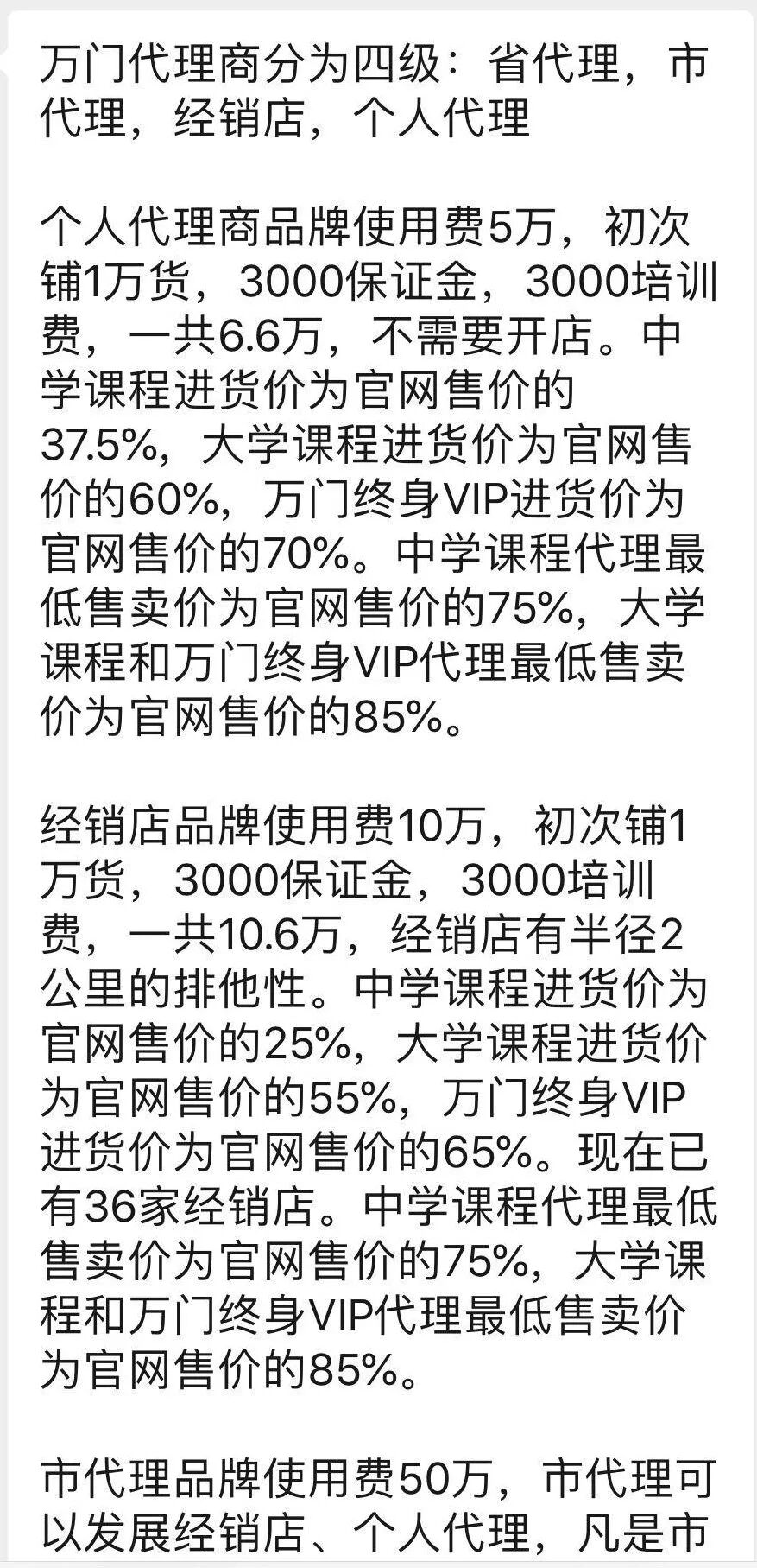 具体来说,万门大学个人代理商品牌使用费5万,初次铺1万货(就是首次要购买价值1万元的课程包),交3000元保证金,3000元培训费,一共6.6万。中学课程进货价为官网售价的37.5%,大学课程进货价为官网售价的60%,万门终身VIP进货价为官网售价的70%。