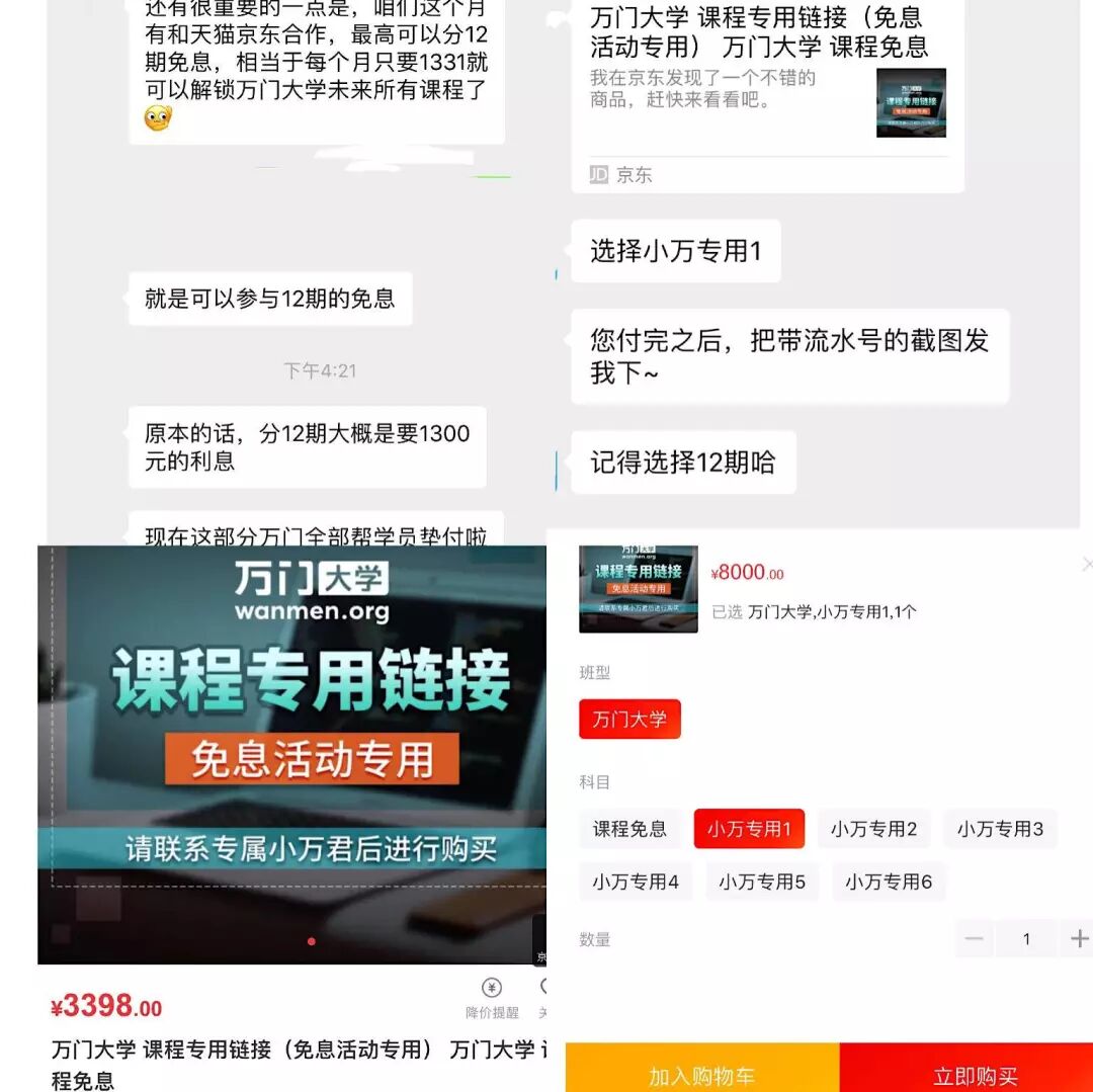 小万君极力推荐的京东白条和花呗组合付款,是万门大学和天猫京东合作的12期免息业务,原本约1300元的利息由万门大学垫付,由小万君专门申请对应额度的链接才能购买。对方还强调这是临时链接,要尽快支付。