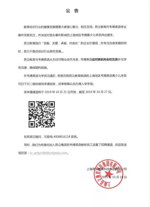 芥末堆大卫 10月18日讯,近日陷入停业风波的韦博英语,在获得英孚教育、学为贵、朗格等机构在学员转换、职工招聘上的帮助后,上海昂立教育也于昨日发布公告称对有意向到昂立就读的上海地区韦博英语青少儿学员伸出援手,申请时间为其一周。并为韦博英语教职员工打开招聘通道。