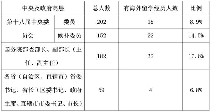 而在第18届中央和地方省部级以上的领导干部中,具有海归背景的领导干部达到65人。在中共18届中央委员和候补中央委员当中,拥有海归背景的人数有40人,占比11.3%。